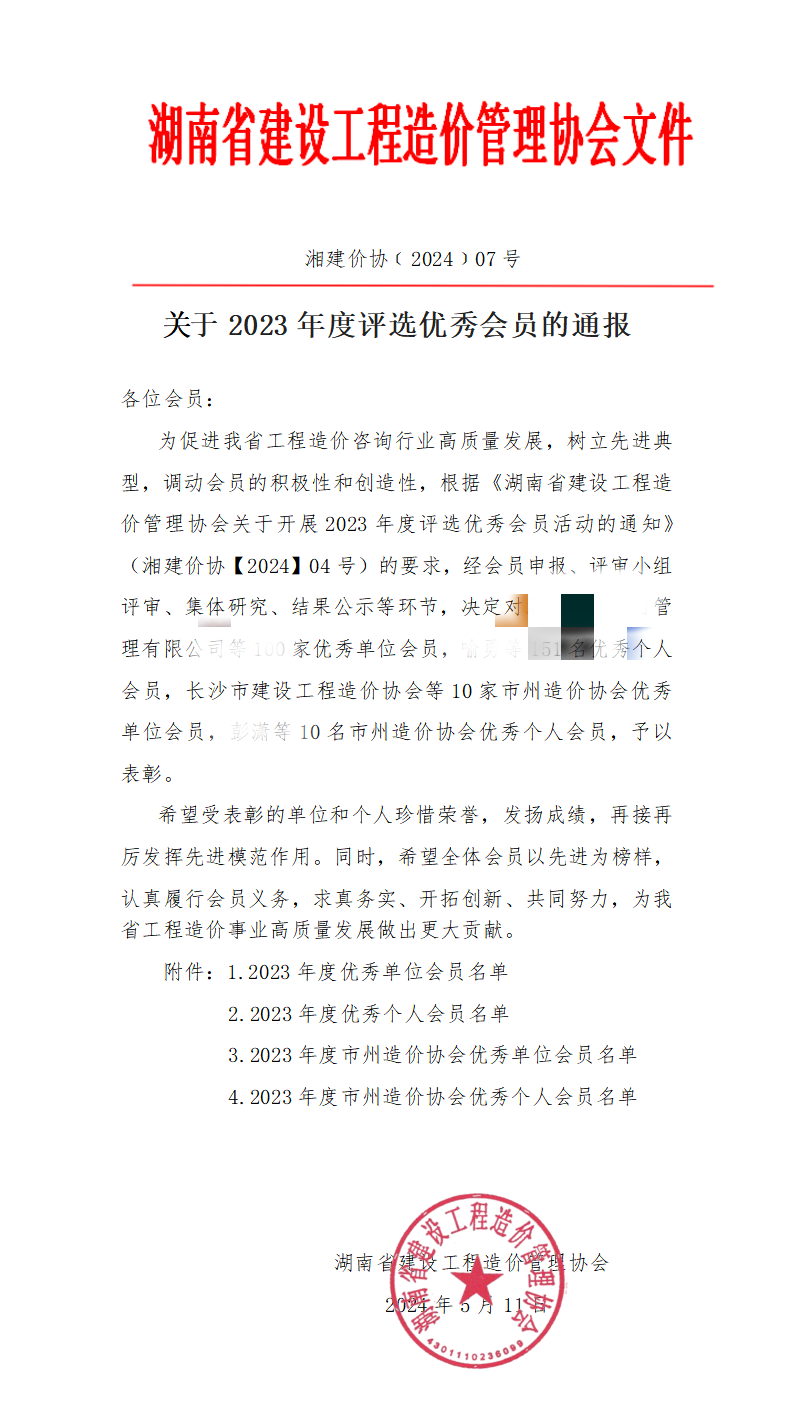 為促進我省工程造價咨詢行業高質量發展,樹立先進典型,根據《湖南省建設工程造價管理協會關于開展2023年度評選優秀會員活動的通知》(湘建價協【2024】04號)的要求,經申報、評審小組評審、集體研究、結果公示等環節,我單位被評為“2023年度優秀單位”。